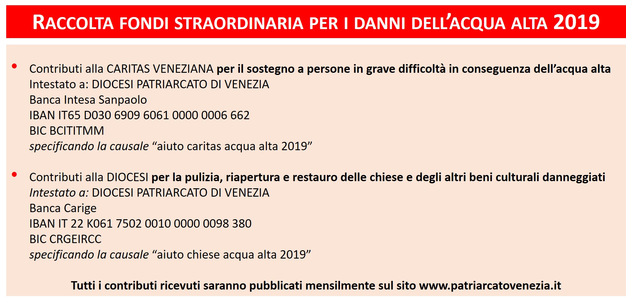 La Diocesi di Venezia ringrazia di cuore quanti desiderano offrire un contributo umano e anche economico e indica due concrete possibilità: