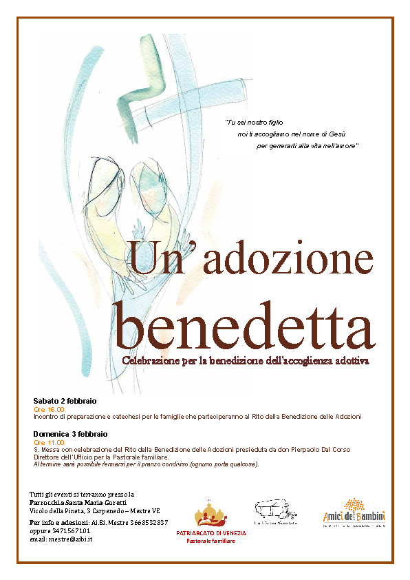 Celebrazione del Rito di Benedizione di tutte le famiglie adottive della Diocesi di Venezia domenica 3 febbraio ore 11.00 c/o la Parrocchia Santa Maria Goretti (Vicolo della Pineta – Mestre VE)