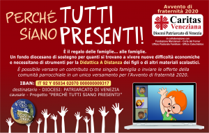 Nel frattempo… l’iniziativa di solidarietà, che accompagna il cammino diocesano di preparazione al Natale, è stata pensata assieme a Caritas diocesana per rispondere ai nuovi bisogni delle famiglie del Patriarcato. Si è verificato che la Didattica A Distanza, sperimentata da tutti nella primavera 2020 e ripresentatasi in questo autunno per gli studenti delle superiori, ci ha sicuramente trovati un po’ più “preparati”, ma continua a creare problemi ai figli di alcune famiglie: quelle che si trovavano già in difficoltà economica prima della pandemia e quelle che la stanno conoscendo ora, per la recente perdita del lavoro o la persistente crisi economica.