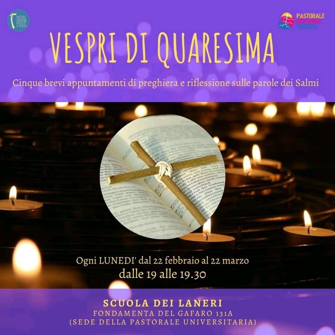 Vespri di Quaresima. I lunedì sera dal 22 febbraio al 22 marzo dalle 20:30 alle 21:30 i giovani sono invitati nella sede della Pastorale Universitaria dei Laneri per cinque momenti di preghiera e riflessione sulle parole dei Salmi.