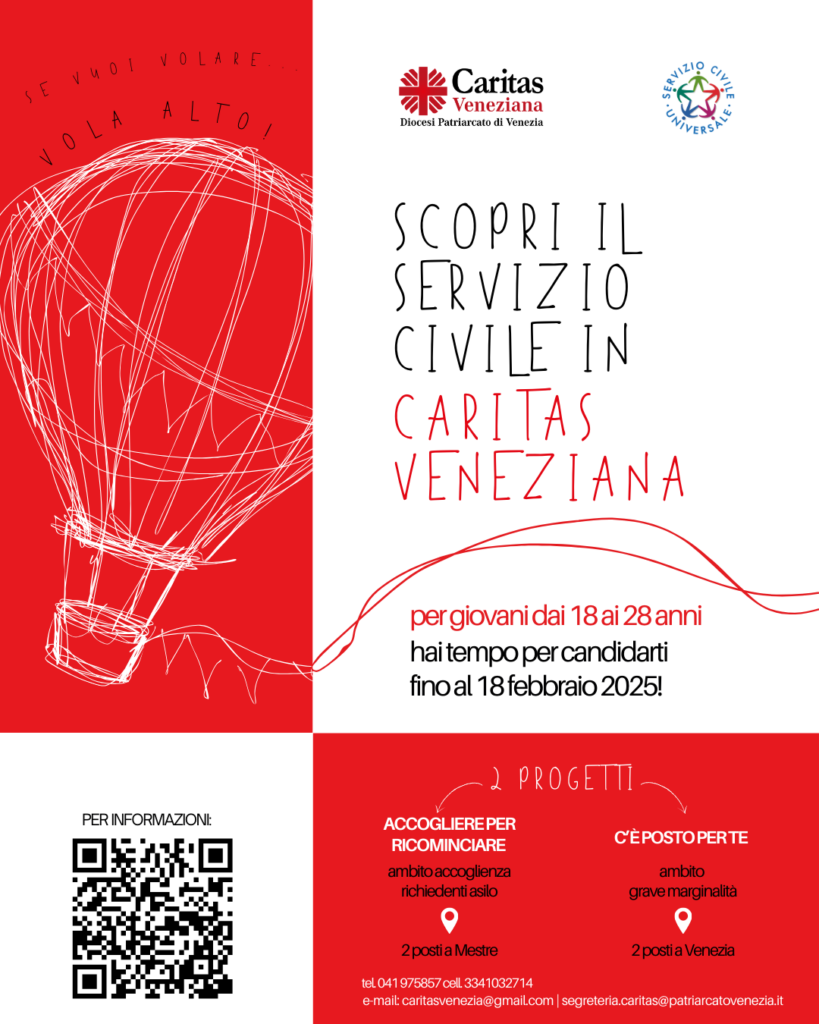 Siamo felici di annunciare che è stato pubblicato il bando nazionale per il Servizio Civile Universale! (puoi consultarlo al seguente link). Il Servizio Civile rappresenta un’importante opportunità di crescita personale e professionale per i giovani tra i 18 e i 28 anni. Caritas Veneziana offre quattro posti disponibili tra Venezia e Mestre, suddivisi in due progetti. Ogni progetto prevede un impegno annuale, a partire da fine maggio 2025, per un totale di 1.145 ore, ed è previsto per ogni volontario un assegno mensile di € 507,30.