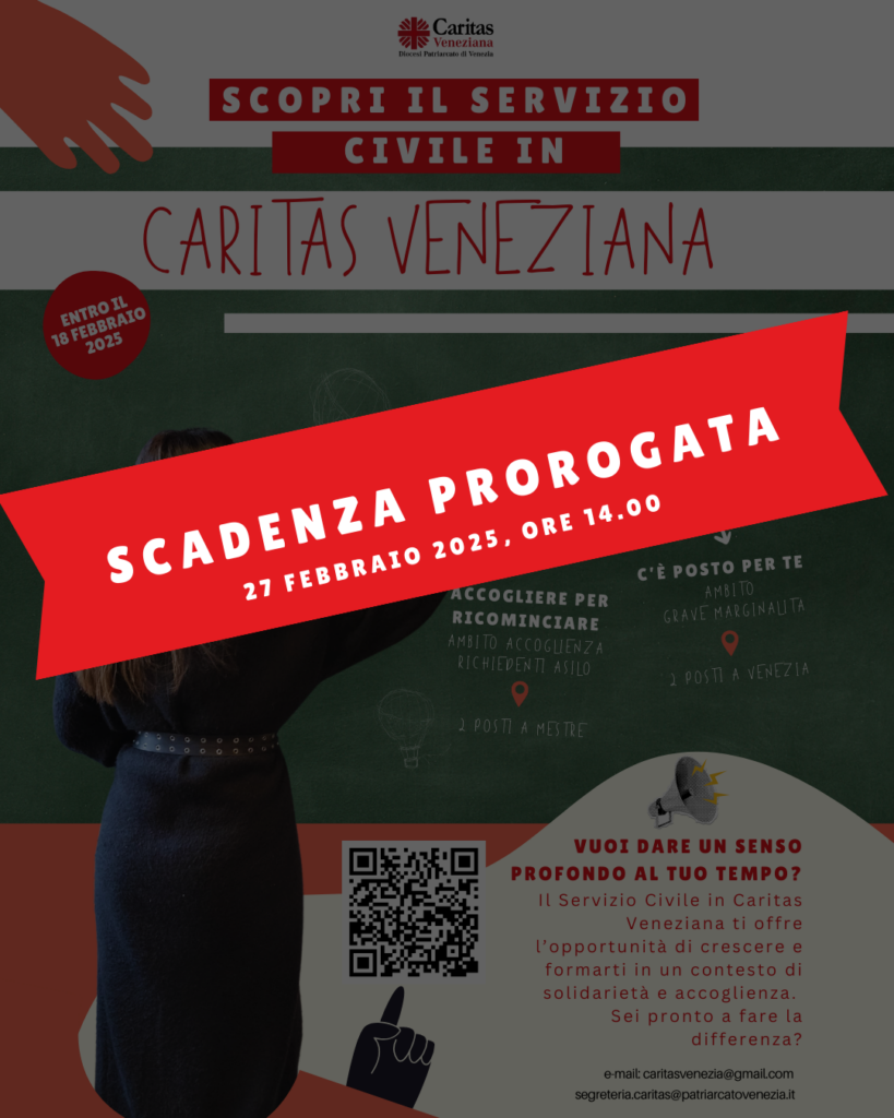 18 Febbraio 202524 Marzo 2025Caritas DiocesanaCaritas italianaIniziativeNotizieYoungCaritasLa scadenza per fare il Servizio Civile in Caritas Veneziana è stata prorogata al 27 febbraio 2025, ore 14:00⏳✨SERVIZIO CIVILE: SCADENZA PROROGATA AL 27 FEBBRAIO 2025 Scopri tutti i dettagli sulla pagina dedicata