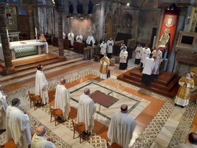 Sabato 30 maggio 2020 Il Patriarca Francesco Moraglia stamane, in San Marco, ha presieduto con i canonici del Capitolo Metropolitano e i Vicari Episcopali e Foranei, la Santa Messa Crismale. La ridotta partecipazione è stata legata alle disposizioni sanitarie vigenti: erano presenti tre diaconi permanenti, una piccola rappresentanza di religiosi, religiose e laici. Al termine […]