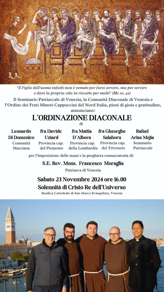 Domani pomeriggio, sabato 23 novembre, alle ore 16, nella basilica cattedrale di San Marco Evangelista di Venezia, il Patriarca Francesco Moraglia ordinerà cinque nuovi diaconi. Saranno ordinati dal Patriarca nella vigilia della solennità di Cristo Re.