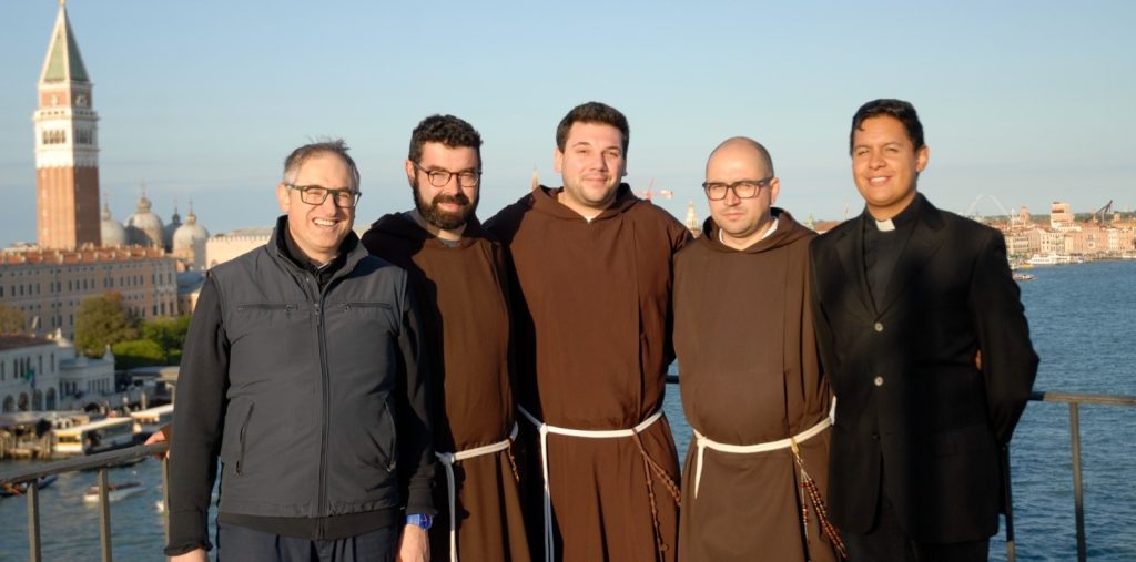 Nella foto i candidati all’ordinazione; nell’ordine da sinistra: Lorenzo Di Domenico, fra Davide Uziard, fra Mattia D’Albora, fra Gheorghe Salahoru e Rafael Arias Mejia.