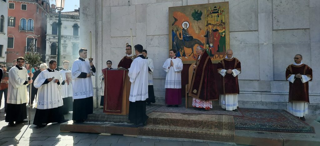 Il Patriarca Francesco ha presieduto stamattina a Venezia la processione e la Santa Messa nella Domenica di Passione e delle Palme. La celebrazione è iniziata alle ore 9.15 da Campo Santa Maria Formosa con la benedizione degli ulivi e delle palme e la proclamazione del Vangelo dell’ingresso di Gesù Cristo in Gerusalemme. Di seguito c’è stata la processione per le calli di Venezia fino alla basilica cattedrale di San Marco dove alle 10.00 è stata celebrata la S. Messa, durante la quale è stato proclamato il Vangelo della Passione del Signore.