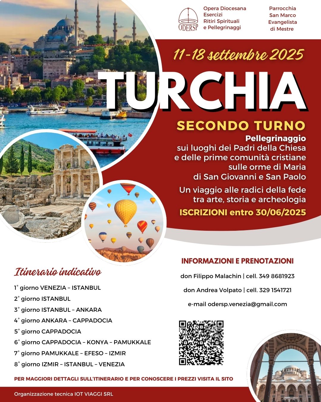 - Nella causale indicare nome e cognome del partecipante e il riferimento al pellegrinaggio: esempio “Rossi Mario – acconto Pellegrinaggio Turchia 2025 – secondo gruppo”.