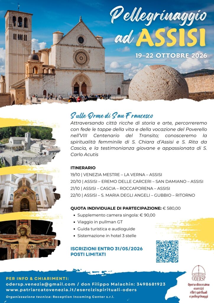 N.B. nella causale indicare nome e cognome del partecipante e il riferimento al pellegrinaggio, per esempio “Rossi Mario – acconto Pellegrinaggio Assisi 2026”. Il saldo andrà effettuato entro il 31 agosto 2026.