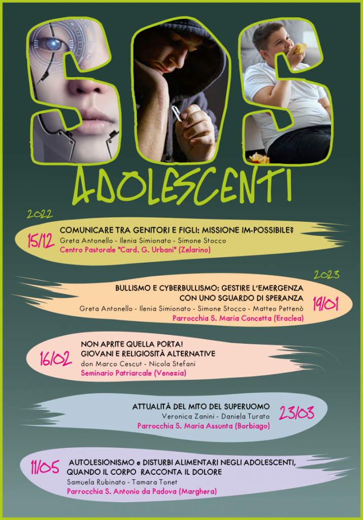 Anche per quest’anno prosegue la proposta formativa offerta a giovani, educatori, genitori, catechisti, insegnanti… che lavorano con gli adolescenti, attraverso un ciclo di 5 incontri per affrontare tematiche molto attuali.