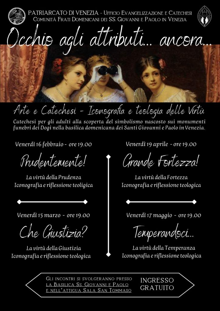 Vista la buona riuscita del primo ciclo di catechesi attraverso l’arte dedicato alle virtù teologali… ecco l’offerta di un nuovo ciclo di 4 appuntamenti presso la Basilica dei SS. Giovanni e Paolo di Venezia, in collaborazione con la Comunità dei Frati Domenicani. “Occhio agli attributi… ancora” questo il titolo generale per un percorso che desidera accompagnare nella conoscenza delle virtù cristiane (prudenza, giustizia, fortezza e temperanza) sia sotto l’aspetto teologico e quello iconografico.