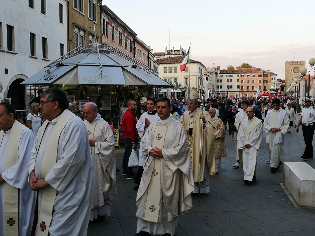 “La Rivelazione cristiana conforta noi, uomini e donne del XXI secolo – per tanti versi così disincantati e secolarizzati -, ricordando come la nostra vita, la nostra storia, le nostre città – anche la nostra Mestre – siano “spazi” in cui si fronteggia il Bene e il male, la Giustizia e l’ingiustizia, la Verità e la menzogna. In questo combattimento, però, l’uomo e le comunità non sono mai lasciate sole ma piuttosto affidate e sostenute da Dio che ci invia questi suoi angeli – messaggeri di Bene, Giustizia e Verità – e in particolare gli arcangeli Raffaele, Gabriele e soprattutto il nostro patrono Michele”: ha concluso così la sua riflessione il Patriarca Francesco Moraglia durante l’omelia della Messa solenne celebrata la sera di sabato 29 settembre nel Duomo di S. Lorenzo di Mestre – gremito di fedeli ed autorità civili e militari – in occasione della festa di san Michele Arcangelo, patrono della città oltreché della Polizia di Stato.