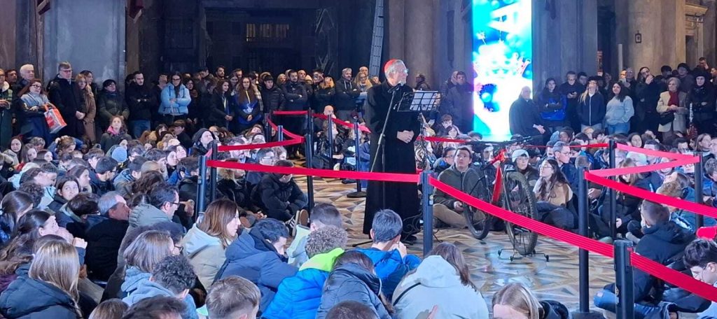 Il Patriarca ha ringraziato Fabio Mariuzzo e ha voluto ricordare anche la testimonianza di Sammy Basso: “Noi abbiamo bisogno di testimoni. I maestri non si ascoltano volentieri. I testimoni si ascoltano perché comunicano la vita. Oggi ci è giunto un messaggio importante: la nostra vita non coincide con la nostra vita biologica. Fabio non è la sua malattia. Dopo una testimonianza così è difficile parlare. Prepariamoci tutti a non stare zitti davanti ad alcune circostanze o situazioni: in casa, in classe, con gli amici, per la strada…non parlare perché è comodo stare zitti, non guardare perché fa comodo guardare dall’altra parte. Il 4 giugno del 2020 mi è venuto a trovare Sammy Basso, affetto da una malattia genetica rara che fa invecchiare precocemente. Ci ha lasciato qualche mese fa a 28 anni. Uscendo da quell’incontro ho sentito che mi aveva cambiato (e gli incontri ci cambiano in bene o in male, ecco perché vanno curati). Vi rimando al suo testamento spirituale. Noi non siamo la nostra malattia, non siamo la nostra bellezza, non siamo la nostra intelligenza o la nostra cultura. la persona va oltre queste cose. Visitare i luoghi di sofferenza o di emarginazione (qui c’è il nostro cappellano della casa circondariale maschile)…Leggete quell’inno alla vita che è il testamento spirituale di Sammy Basso”.