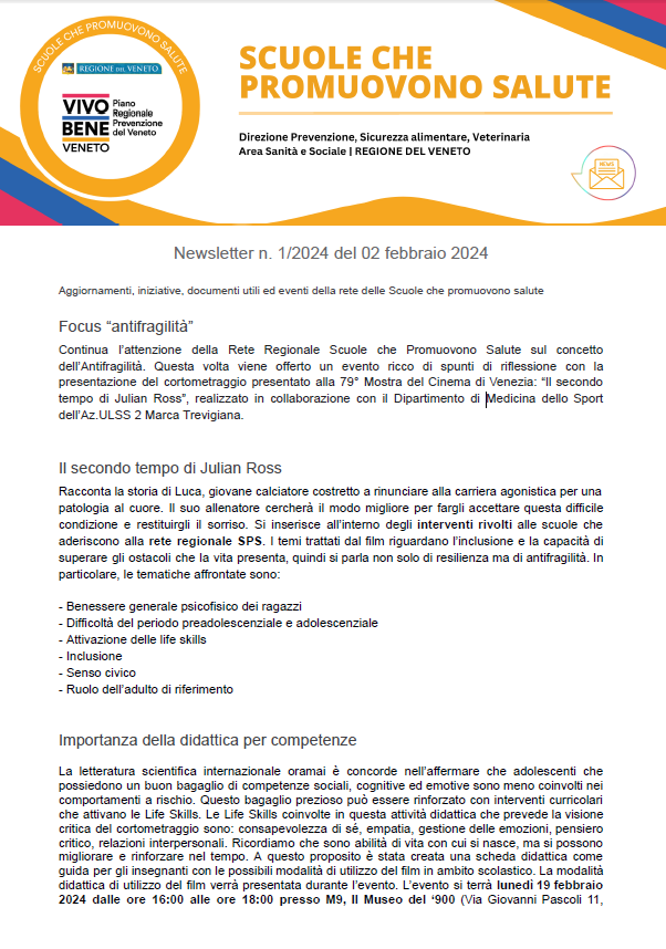 Continua l’attenzione della Rete Regionale Scuole che Promuovono Salute sul concetto dell’Antifragilità. Questa volta viene offerto un evento ricco di spunti di riflessione con la presentazione del cortometraggio presentato alla 79° Mostra del Cinema di Venezia: “Il secondo tempo di Julian Ross”, realizzato in collaborazione con il Dipartimento di Medicina dello Sport dell’Az.ULSS 2 Marca Trevigiana […]