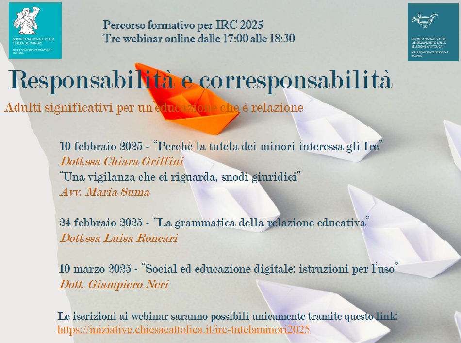 Le iscrizioni ai webinar saranno possibili unicamente tramite questo link: https://iniziative.chiesacattolica.it/irc-tutelaminori2025
