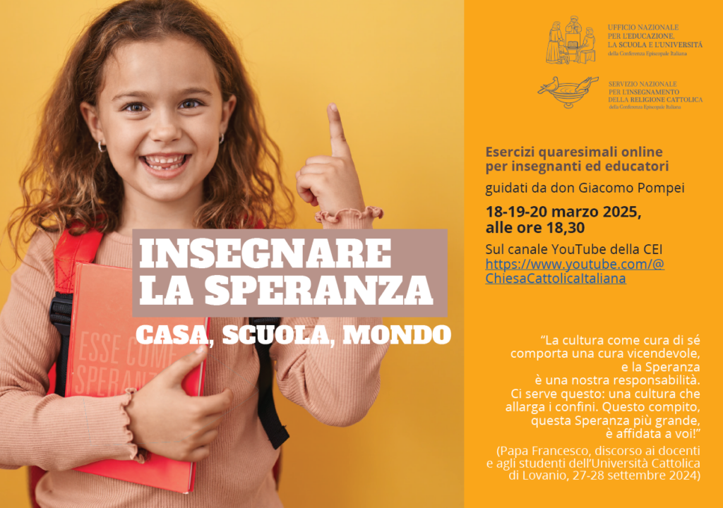 Esercizi quaresimali online per insegnanti ed educatori guidati da don Giacomo Pompei. 18-19-20 marzo 2025, alle ore 18,30 sul canale YouTube della CEI https://www.youtube.com/@ChiesaCattolicaItaliana
