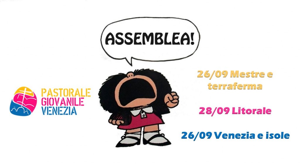 5 Settembre 2016Equipe e ConsultaNewsAssemblee operatori Past. Giovanile 26/09 Zona Mestre e terraferma ore 20.30 Centro Pastorale di Zelarino 28/09 Zona Litorale ore 20.30 S. Maria Concetta di Eraclea 29/09 Zona Venezia e isole ore 20.30 Patronato dei Frari