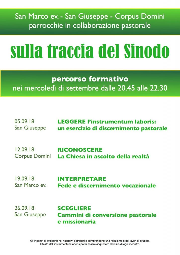 29 Agosto 201829 Agosto 2018AdolescentiGiovaniNewsSinodo dei giovani 2018Sulla traccia del Sinodo La Collaborazione mestrina S. Marco-S. Giuseppe-Corpus Domini apre le porte per un percorso formativo in 4 serate sul prossimo Sinodo dei giovani, in particolare il testo dell’Instrumentum Laboris.