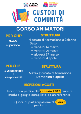 Per quanti svolgono già – o si accingono ad iniziare – il servizio di animazione, sono state pensate delle serate formative nel mese di marzo e aprile 2025, con sede al Centro Pastorale “Card. G. Urbani” di Zelarino, dalle ore 20.30 alle ore 22.30 circa.