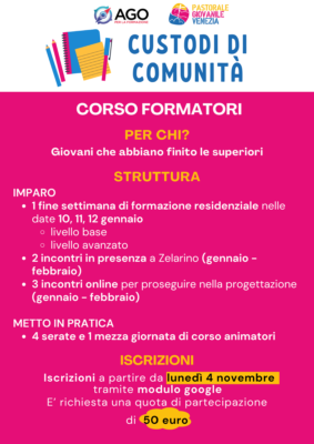 In collaborazione con Gigi Cotichella e gli educatori di AGO per la formazione, la Pastorale Giovanile di Venezia ha messo a punto un progetto che vuole “guardare più lontano” nell’ambito formativo, per non cadere nel rischio (sempre in agguato) di offrire pillole ad efficacia immediata da somministrare ai ragazzi delle superiori che si mettono a servizio dei più piccoli, magari incalzati dalle necessità di attivare attività estive in parrocchia e specialmente i GREST.
