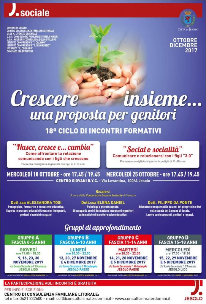 L’ASSOCIAZIONE CENTRO S. MARIA MATER DOMINI o.n.l.u.s. – Centro di Consulenza Familiare Litorale promuove l’iniziativa del Comune di Jesolo “Crescere Insieme – una proposta per genitori”, giunta alla 18a edizione