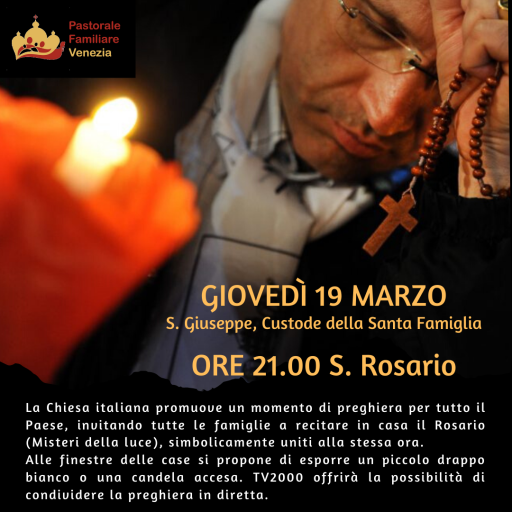 In questo momento di emergenza sanitaria, la Chiesa italiana promuove un momento di preghiera per tutto il Paese, invitando ogni famiglia, ogni fedele, ogni comunità religiosa a recitare in casa il Rosario (Misteri della luce), simbolicamente uniti alla stessa ora: alle 21 di giovedì 19 marzo, festa di San Giuseppe, Custode della Santa Famiglia. Alle finestre delle case si propone di esporre un piccolo drappo bianco o una candela accesa.