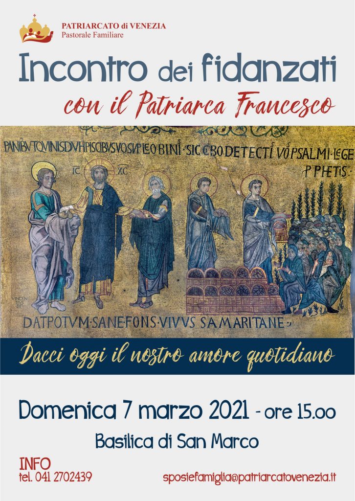 Come anticipato ai gruppi indicati, riprende l’incontro dei fidanzati col Patriarca, per cui tutti coloro che si sono preparati o si stanno preparando al matrimonio sono invitati il 7 marzo 2021 alle ore 15.00 nella Basilica di San Marco a Venezia. Scarica la Locandina_fidanzati_PDF