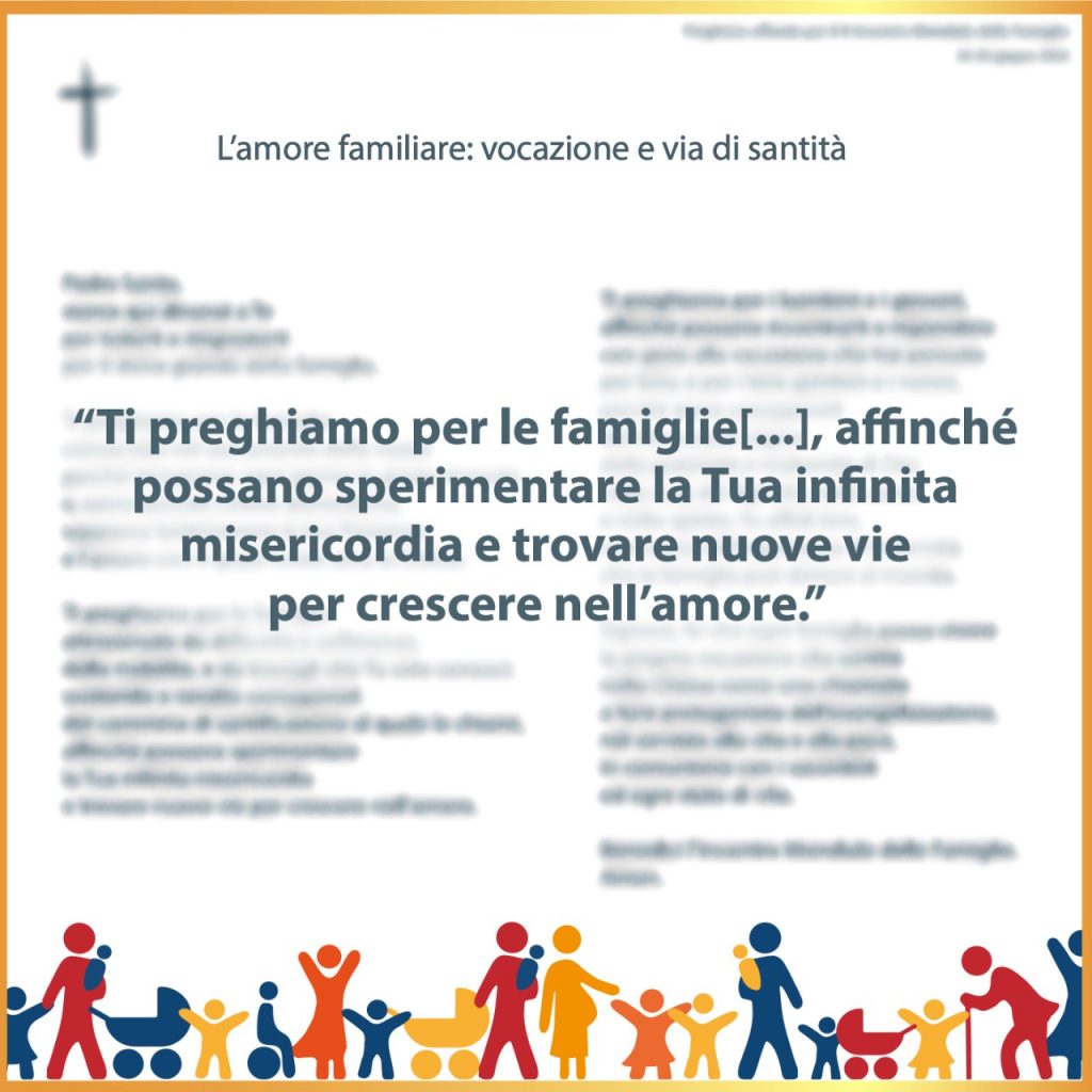 Il testo prende spunto dal tema scelto da Papa Francesco per l’Incontro: “L’amore familiare: vocazione e via di santità”. La preghiera è pensata come uno strumento pastorale: può essere recitata fin d’ora in parrocchia, nelle comunità, a casa per prepararsi all’evento internazionale dell’anno prossimo. “È dall’amore vissuto in famiglia che nasce la vocazione di ogni figlio; è l’amore gustato tra le pareti domestiche a far muovere i primi passi sulla via della santità”, aggiunge il cardinale Farrelli. L’esperienza della preghiera introduce al senso profondo e salvifico delle relazioni nella vita quotidiana.