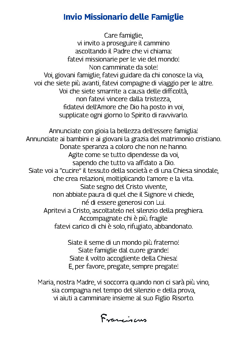 Il papa ci invita a far nostro l’invio missionario che ha dato alle famiglie.