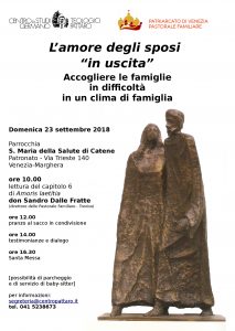 Riprende il ciclo di incontri di lettura dell’esortazione Amoris laetitia, promosso dal Centro Pattaro e quest’anno realizzato in collaborazione con l’Ufficio per la Pastorale Familiare del Patriarcato. Il tema conduttore di questo nuovo ciclo sarà L’amore degli sposi “in uscita” e verranno considerati i capitoli 6 e 7 dell’esortazione. Il primo appuntamento sarà una giornata […]