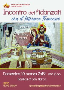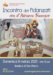 Il Patriarca attende tutti i fidanzati che si preparano al Matrimonio, assieme alle loro guide e ai sacerdoti, domenica 10 marzo alle ore 15.00 nella Basilica di S. Marco. Sarà l’occasione per ascoltare la testimonianza di una giovane coppia e dialogare col Patriarca per approfondire la bellezza del mistero sponsale.
