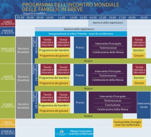 L’Incontro Mondiale delle Famiglie 2018 sarà un’occasione gioiosa e arricchente per adulti, giovani e bambini. Durante questi cinque giorni ci saranno momenti di incontro, tempo per condividere, pregare e riflettere, crescere nella fede e nell’amore, festeggiare, oltre a raccogliere le forze per continuare il cammino della vita. Alla base di tutto, quattro momenti principali: Clicca […]