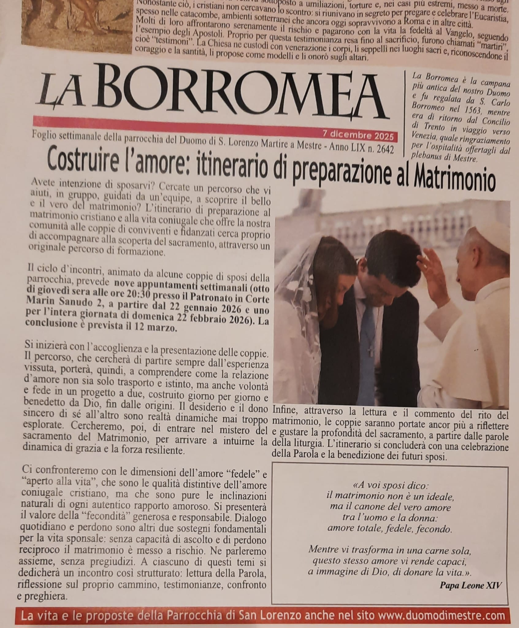 - Le Parrocchie del Litorale di Jesolo Lido propongono il Corso Fidanzati intitolato “Crescere insieme: un cammino per fidanzati”, a partire dal 16 gennaio 2026. Date e recapiti per informazioni nella locandina.