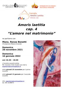 In data 19 marzo 2021 il Patriarca Francesco Moraglia ha firmato la lettera “Vi fu una festa di nozze a Cana di Galilea” che intende accompagnare il cammino pastorale della Diocesi di Venezia nel corso di quest’anno dedicato da Papa Francesco alla famiglia e all’approfondimento dell’esortazione apostolica “Amoris laetitia”. L’anno di Amoris laetitia possa aiutarci […]