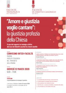 CONVEGNO INTER-FACOLTÀ “Amore e giustizia voglio cantare”: la giustizia profezia della chiesa. Il nesso del rapporto tra teologia e diritto alla luce dei dibattiti suscitati da Amoris laetitia giovedì 12 marzo 2020 ore 9-17 Padova – Facoltà teologica del Triveneto Iscrizioni obbligatorie entro il 5 marzo Giovedì 12 marzo a Padova, nella […]