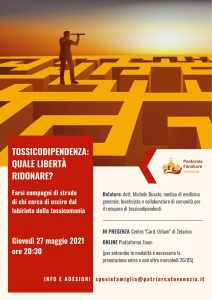 Dopo l’interessante e partecipata serata formativa dello scorso 22 aprile sul tema della pornografia, la Pastorale Familiare propone un nuovo appuntamento in ambito educativo giovedì 27 maggio per affrontare – su sollecitazione di molti – la delicata questione della tossicodipendenza, fenomeno diffuso e che ci trova spesso impreparati. Ci aiuterà il dott. Michele Busato. È […]