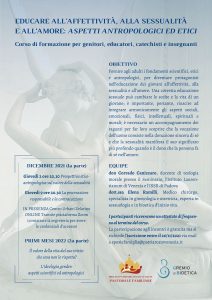 Il 16 novembre ricomincia il corso di formazione per genitori, educatori, catechisti e insegnanti, promosso dal nostro ufficio diocesano di pastorale familiare, dall’associazione Gremio di Bioetica, dall’Associazione Centro S. Maria Mater Domini e altri collaboratori qualificati. Si tratta di un percorso base di educazione affettivo-sessuale sugli aspetti medici, emotivi, intellettuali, sociali e spirituali per dialogare […]