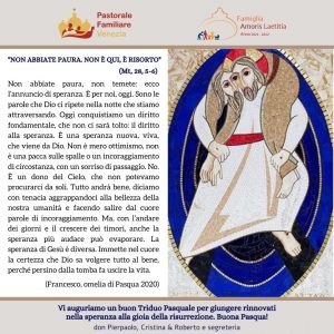 “Non abbiate paura. Non è qui, è risorto” (Mt, 28, 5-6). Non abbiate paura, non temete: ecco l’annuncio di speranza. È per noi, oggi. Sono le parole che Dio ci ripete nella notte che stiamo attraversando. Oggi conquistiamo un diritto fondamentale, che non ci sarà tolto: il diritto alla speranza. È una speranza nuova, viva, che viene da […]
