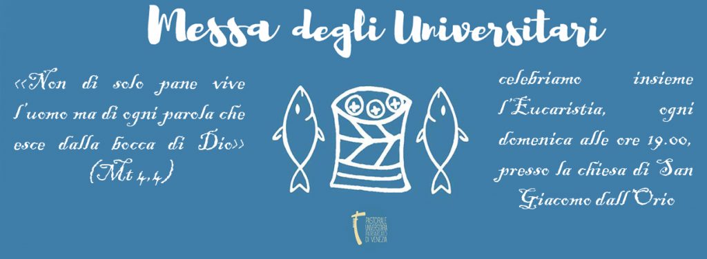 La domenica sera, alle 19.00, presso la chiesa di San Giacomo dall’Orio, la celebrazione eucaristica è animata principalmente dagli studenti universitari: è l’occasione in cui la comunità che noi siamo trova il suo principale nutrimento. Come sta scritto nel Vangelo secondo Marco (e anche in quello secondo Luca e nel Deuteronomio), lo spirito richiede il suo proprio cibo: l’eucaristia.