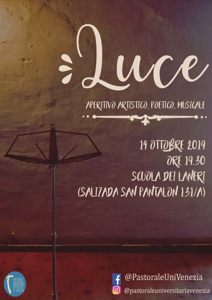 Il primo evento dell’anno che abbiamo organizzato come Pastorale Universitaria è stato su un tema che è e rimarrà sempre di profonda attualità: la Luce. Lunedì 14 ottobre 2019 abbiamo invitato gli studenti universitari per «un aperitivo artistico, poetico e musicale». L’evento voleva essere motivo di incontro e di condivisione, attraverso diverse forme di espressione, di cosa sia per noi la Luce, da dove essa provenga, e che importanza essa abbia nella nostra vita