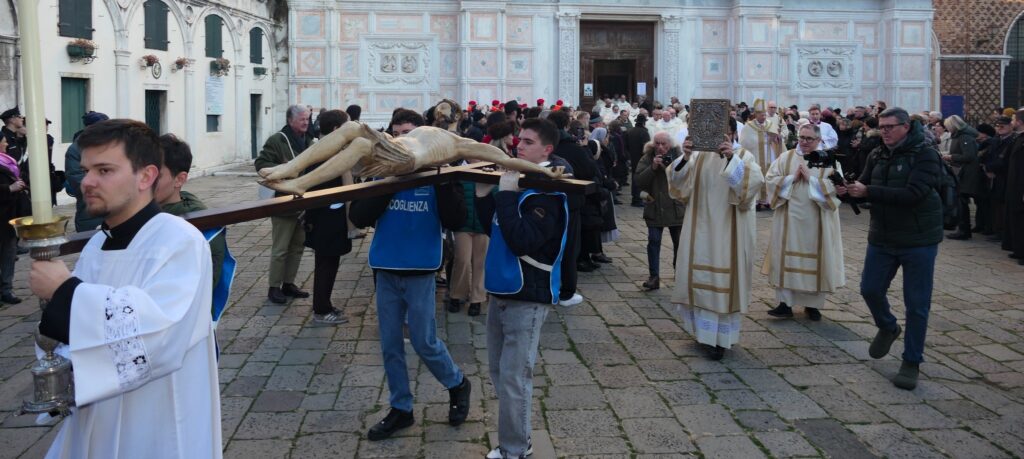 Oggi, domenica della Santa Famiglia nell’Ottava del Natale, il Patriarca Francesco Moraglia ha presieduto la solenne celebrazione di apertura del Giubileo Ordinario del 2025 nella Diocesi di Venezia secondo le indicazioni date dal Santo Padre Francesco nella Bolla di Indizione. Il rito, composto da una processione iniziata dalla chiesa di San Zaccaria a Venezia e conclusasi nella basilica cattedrale di San Marco Evangelista, ha visto partecipi i fedeli, i presbiteri, i diaconi, le religiose e i religiosi della Diocesi. Dinanzi al portale della basilica di San Marco è avvenuto il rito dell’ostensione della Croce, la memoria del Battesimo e l’aspersione con l’acqua lustrale. Condividiamo il testo integrale dell’omelia pronunciata dal Patriarca.