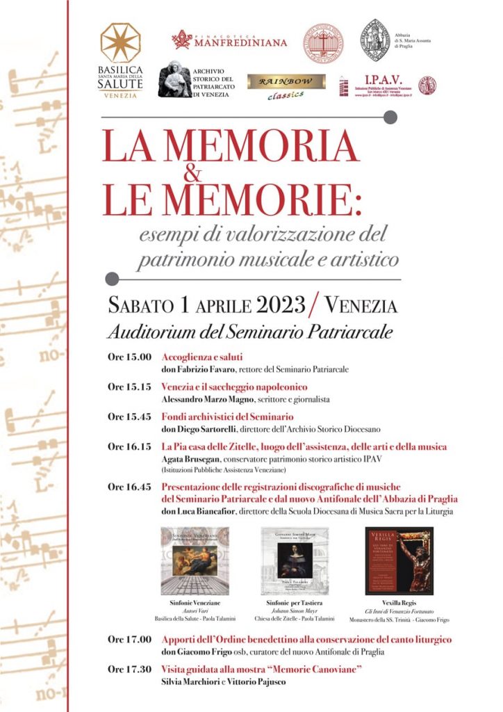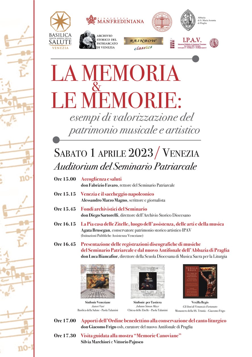 All’interno del ricco programma è prevista anche la “Presentazione delle registrazioni discografiche di musiche del Seminario Patriarcale e dal nuovo Antifonale dell’Abbazia di Praglia”, presentazione curata da don Luca Biancafior. Subito dopo anche p. Giacomo Frigo osb, docente e collaboratore della Scuola, terrà il suo intervento in merito agli “Apporti dell’Ordine benedettino alla conservazione del canto liturgico”