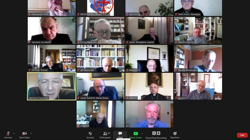 Nuovo incontro in videoconferenza, oggi pomeriggio, per i Vescovi della Conferenza Episcopale Triveneto (v. foto in allegato): nella prima parte dei lavori vi è stato uno scambio di riflessioni, considerazioni e prime verifiche sulla ripresa delle celebrazioni eucaristiche aperte ai fedeli (secondo le disposizioni del protocollo CEI-Governo del 7 maggio 2020).