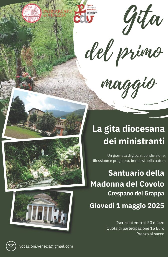 Il primo maggio vivremo la Gita diocesana dei ministranti che si svolgerà a Crespano del Grappa. Giocheremo e vivremo dei tornei presso i giardini della casa di spiritualità della diocesi di Treviso “Don Chiavacci” per poi spostarci al vicino santuario della Madonna del Covolo per la Santa Messa presieduta dal Patriarca Francesco.