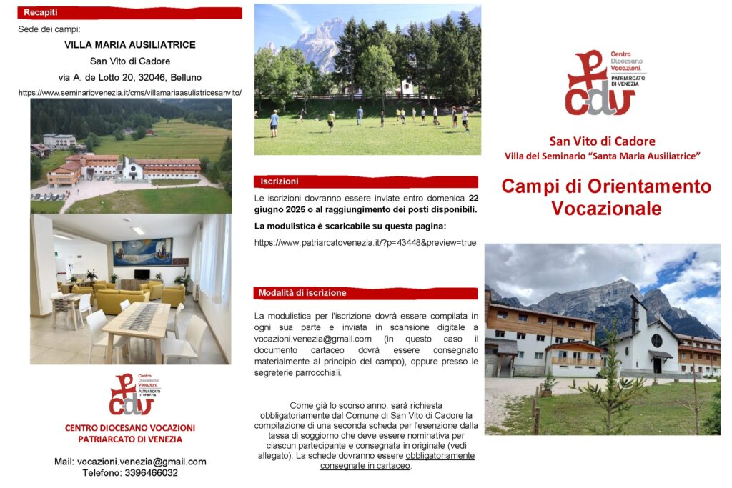 Anche quest’estate la Diocesi e il Seminario Patriarcale proporranno due campi dedicati al discernimento vocazionale dei ragazzi. Si aprono dunque le iscrizioni per i prossimi campi vocazionali per i giovani e per i ministranti presso la casa del Seminario a San Vito di Cadore il prossimo agosto.