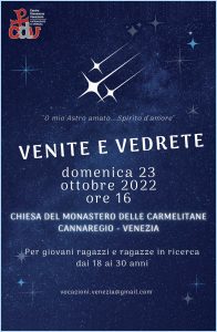 Riprende la proposta di incontri del cammino “Venite e Vedrete” offerto a ragazzi e ragazze in ricerca dai 18 ai 30 anni. Il primo appuntamento è per domenica 23 ottobre alle ore 16.00, presso la chiesa del monastero delle carmelitane a Cannaregio. Per info: vocazioni.venezia@gmail.com